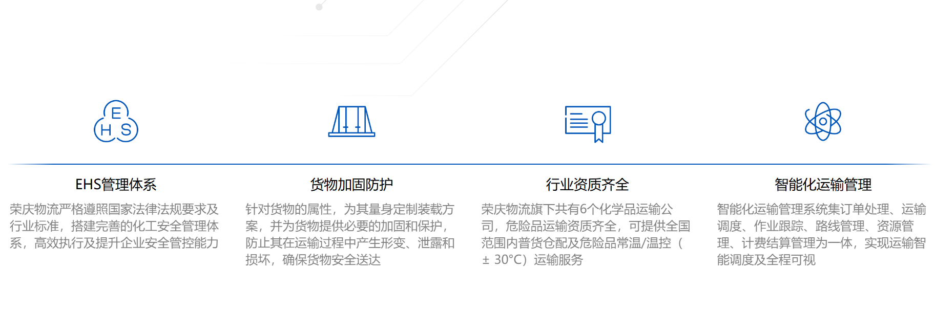 荣庆物流依靠完备的EHS体系 全程透明可追溯,为客户提供安全可靠的化工物流服务 完善的化工安全管理体系 确保全流程合规、安全